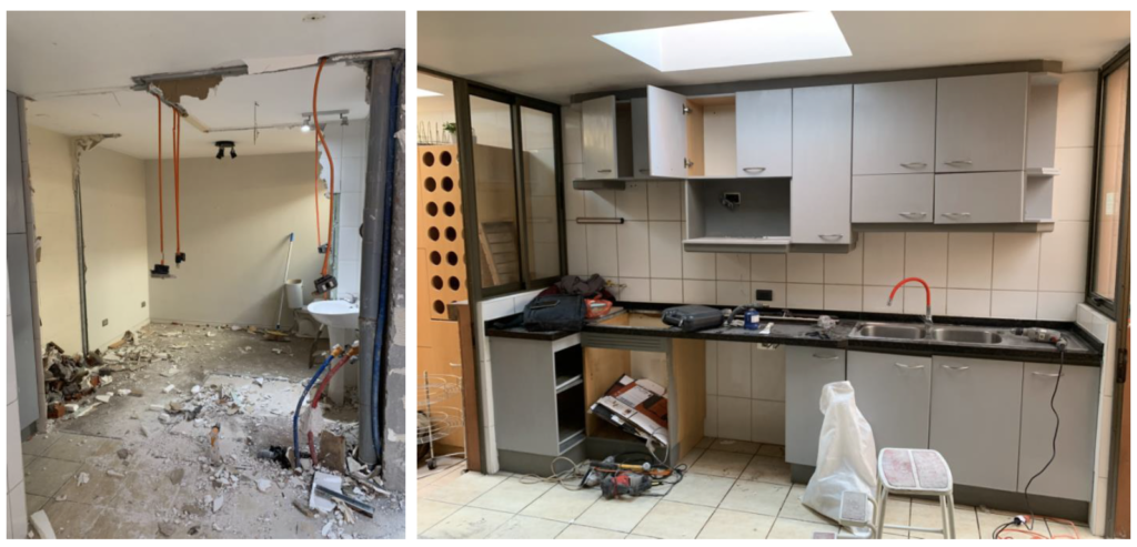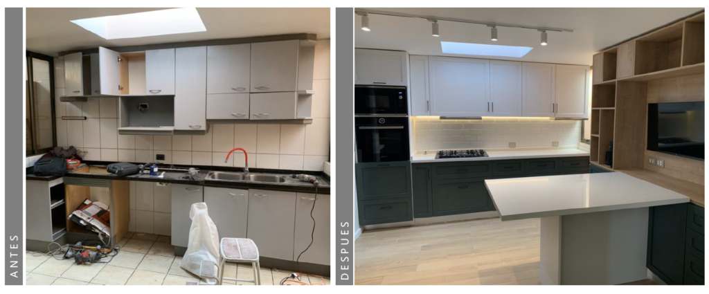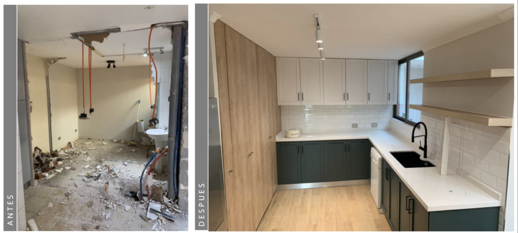 Cocina de 14 mt2 se amplia, utilizando el espacio de pieza y baño de servicio para dejar una cocina de 25 mt2 con mesón isla.