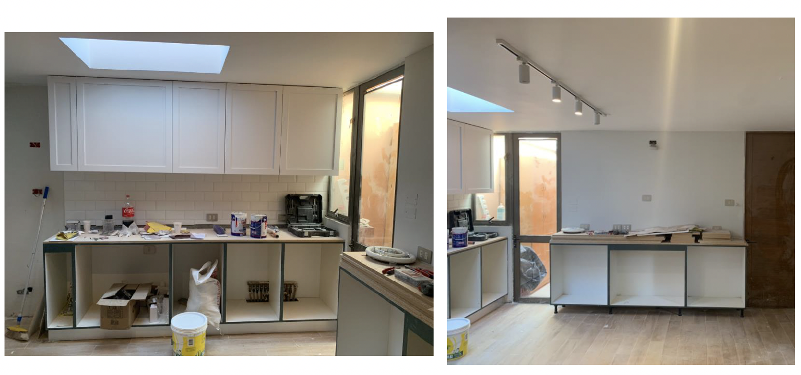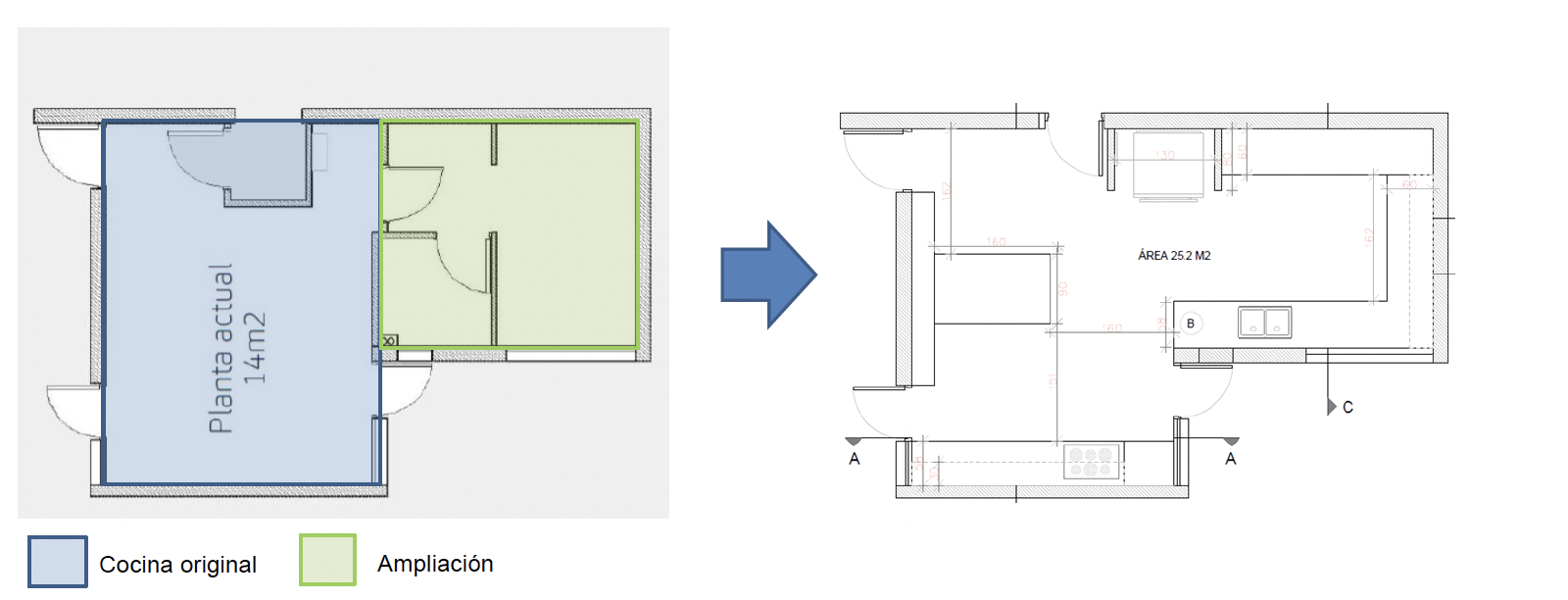Cocina de 14 mt2 se amplia, utilizando el espacio de pieza y baño de servicio para dejar una cocina de 25 mt2 con mesón isla.